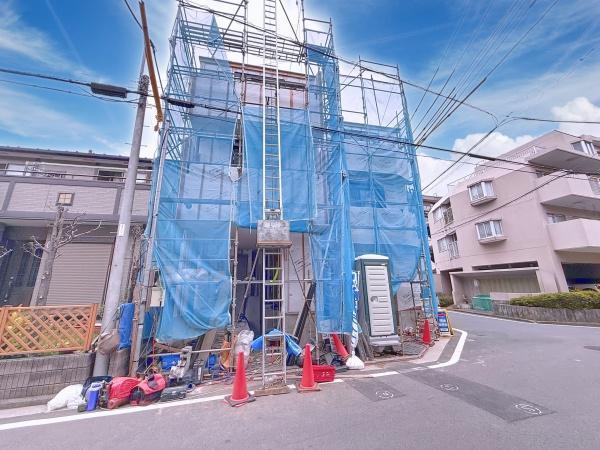 建築中の物件で今後の仕上がりが期待できる外観です。角地に位置しており開放感を感じられる設計です。周囲は静かな住宅街で落ち着いた雰囲気が漂います。青い養生ネットで丁寧に施工管理がされています。
