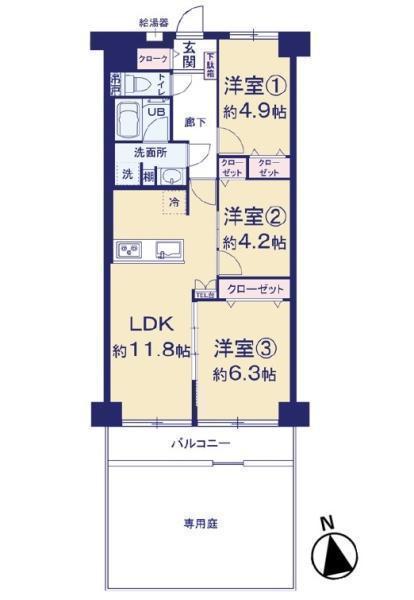 3つの洋室と広々としたリビングダイニングが特徴の間取りです。全室に収納スペースが備わっております。バルコニーと専用庭付きで開放感もあります。水まわりがコンパクトにまとまっています。