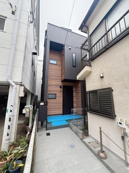 スタイリッシュな玄関ドアが建物の印象を引き立てます。宅配ボックスやインターホンが設けられており日常の利便性も考えられています。木目調の外壁とシンプルなアプローチが調和しています。