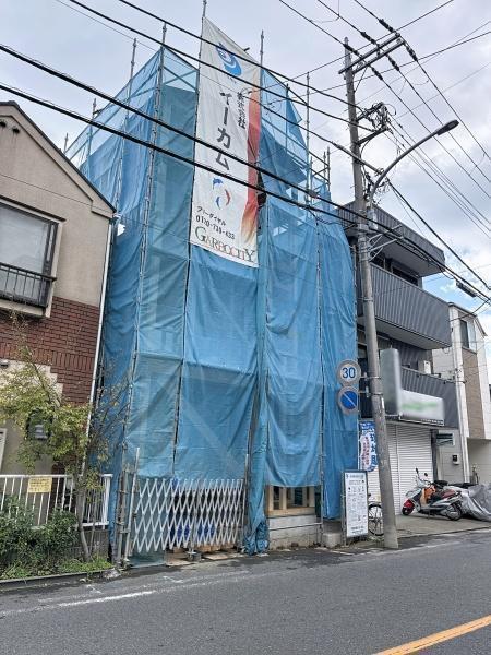建築中の物件が道路沿いに位置しアクセスの良さを感じさせます。周囲には住宅や店舗が立ち並び街並みに調和した環境です。青いシートが印象的で現在進行形の建築が確認できます。
