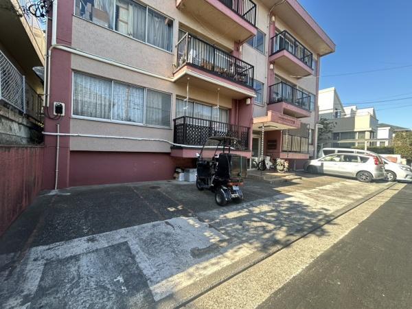 建物のすぐそばに駐車スペースが確保されています。敷地内なので安心して駐車ができます。地面はアスファルトで車の出し入れもスムーズです。周囲は住宅に囲まれており視認性も良好です。