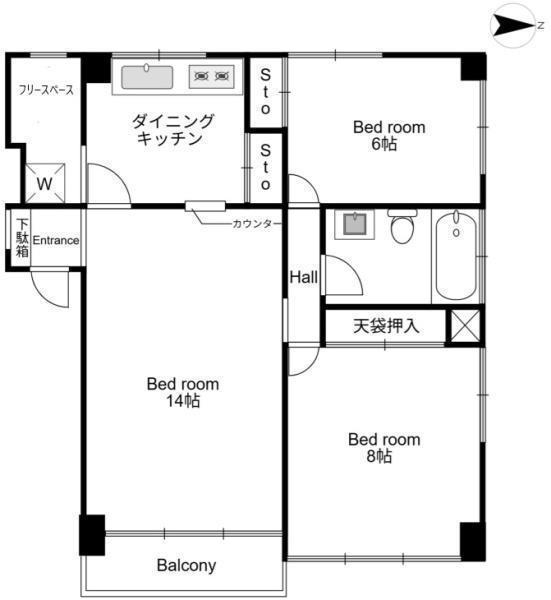 広々としたダイニングキッチンが中央に配置され各部屋の動線が良い間取りです。3つのベッドルームがあり用途に応じた使い分けが可能です。大きなバルコニー付きで14帖のベッドルームから出入りできます。