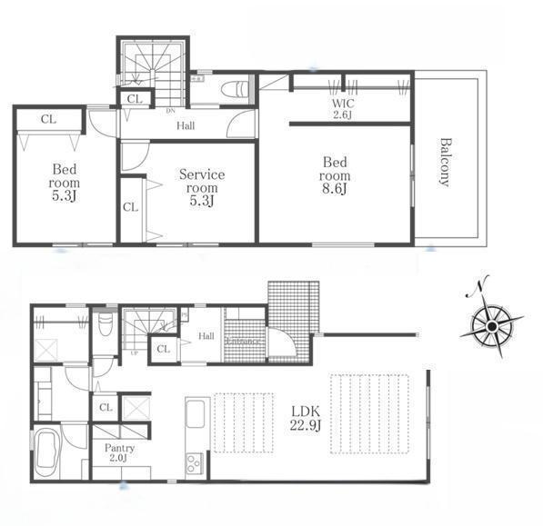 広々としたLDK22.9帖が特徴の間取りです。2階には8.6帖のベッドルームに加えサービスルームやバルコニーが配置されています。各部屋には収納がありパントリーも備えられています。