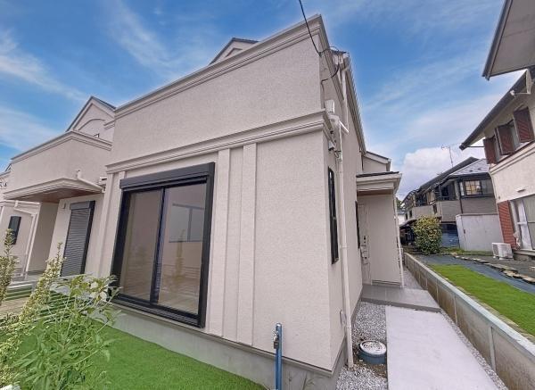 シンプルなデザインが印象的な外観です。明るい壁色が周囲と調和しています。平屋風の構造で安心感があります。窓が大きく開放的な雰囲気を感じられます。