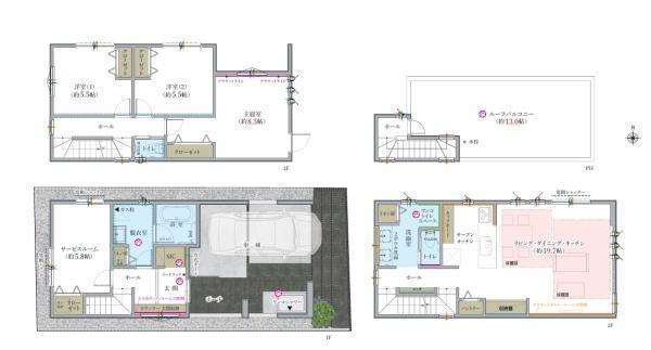 1F S(納戸) 5.8帖 、2F LDK 19.7帖 、3F 洋 8.5帖 、3F 洋 5.5帖 、3F 洋 5.5帖