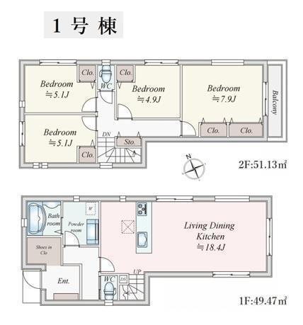 1F LDK 18.4帖 、2F 洋 7.9帖 、2F 洋 4.9帖 、2F 洋 5.1帖 、2F 洋 5.1帖