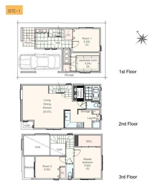 1F S(納戸) 5.2帖 、1F 和 5.2帖 、2F LDK 20.0帖 、3F 洋 5.0帖 、3F S(納戸) 6.9帖