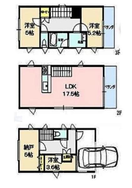1F 洋 3.6帖 、1F S(納戸) 5.0帖 、2F LDK 17.5帖 、3F 洋 5.0帖 、3F 洋 5.2帖
