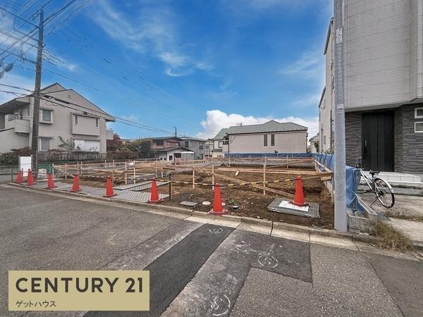 現地の様子が一目でわかる写真です。前面道路が広めで車の出入りがしやすそうです。周囲には住宅が並び落ち着いた街並みとなっています。建築作業も進行中で今後の変化が期待されます。
