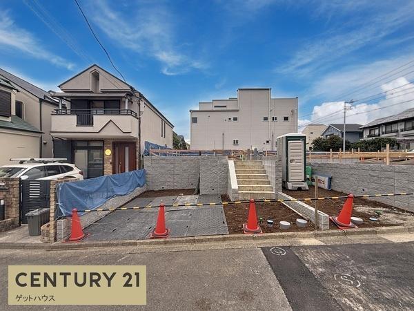 開放感のあるスペースに囲まれた敷地です。段差が設けられており落ち着いた雰囲気が広がります。道路からの進入も便利な配置です。周辺も整然とした街並みが特徴的です。工事現場としての管理も行き届いています。