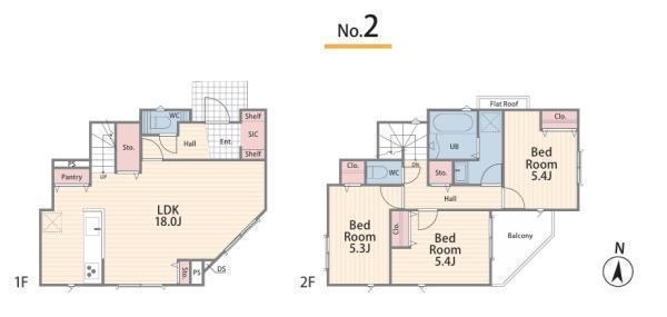 1F LDK 18.0帖 、2F 洋 5.4帖 、2F 洋 5.4帖 、2F 洋 5.3帖