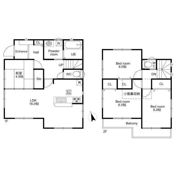 2階建ての間取りでLDKや3つのベッドルーム和室が設けられています。各部屋に収納スペースがあり使いやすさを考えた設計です。バルコニー付きで住空間が広がります。