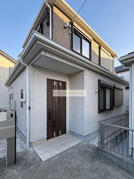 現代的な外観デザインが印象的な住宅です。白を基調とした外壁とブラウンの玄関ドアが調和しています。日当たりも良好で開放感を感じられます。屋根や外壁のメンテナンスも手軽に行えそうです。