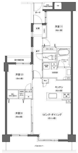 3つの洋室と広々としたリビング・ダイニングが特徴の間取りです。水回りが一カ所にまとまっていて動線が便利です。各部屋に収納スペースが設けられており日常の使い勝手に配慮されています。
