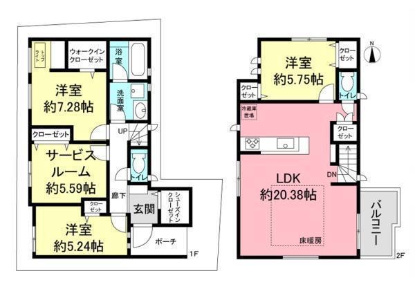 1F 洋 7.2帖 、1F 洋 5.2帖 、1F S(納戸) 5.5帖 、2F LDK 20.3帖 、2F 洋 5.7帖