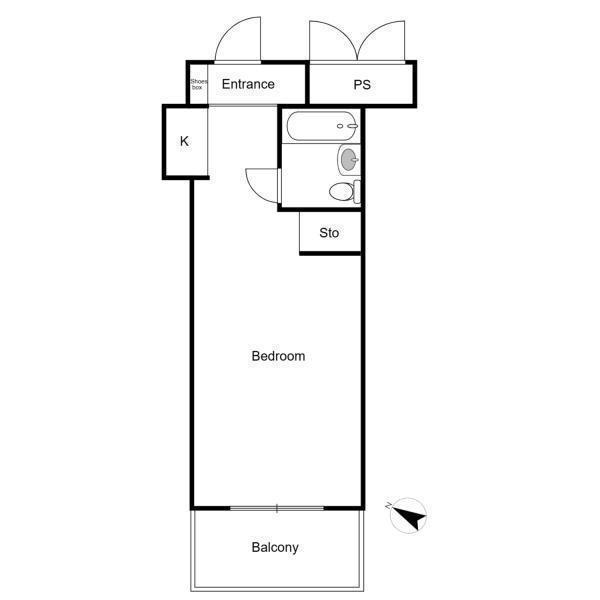シンプルな1Kタイプの間取りで使い勝手の良さが魅力です。バルコニー付きで室内に自然光を取り入れやすい配置です。玄関から室内まで一直線の動線で生活がしやすい構造です。収納スペースも確保されています。