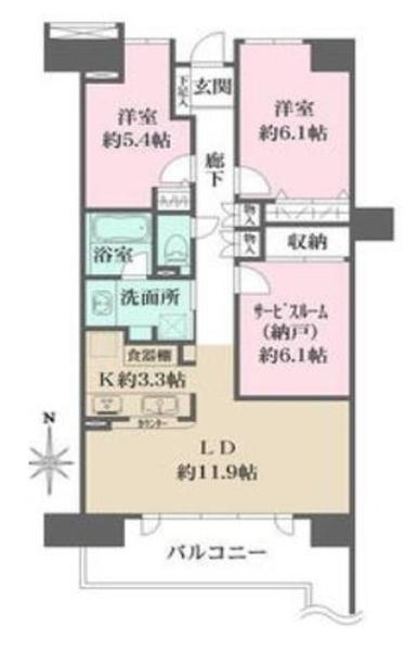 サービスルームや収納が充実し住空間に余裕を持たせた間取りです。各部屋がしっかり確保されており用途に合わせた使い方が可能です。バルコニーもあり開放的なレイアウトが特徴です。