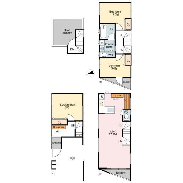 1F 洋 7.0帖 、2F LDK 17.3帖 、3F 洋 5.5帖 、3F 洋 5.4帖