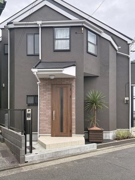 シンプルな外観が印象的です。ダークトーンの外壁と木目調の玄関ドアが調和しています。植栽がポイントになっています。通り沿いに面した立地で存在感があります。すっきりとしたフォルムです。