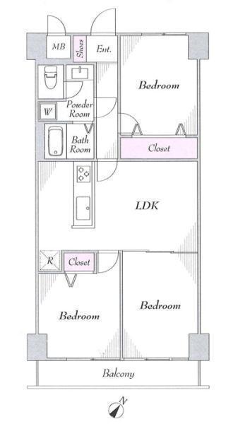 3つの洋室が配置されており用途に応じた使い分けが可能です。リビングとダイニングが開放的なLDKとなっています。収納スペースとしてクローゼットが2か所に備わっています。