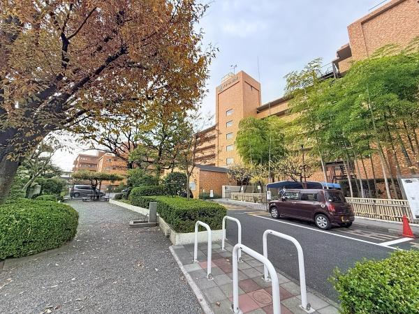 レンガ調の外観が特徴的な建物です。緑豊かな植栽が敷地内を囲んでいます。外構が整備されており清潔感があります。エントランスまでのアプローチもゆったりとしています。落ち着いた雰囲気の街並みです。