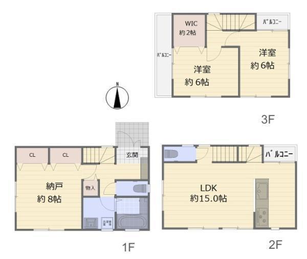 1F S(納戸) 8.0帖 、2F LDK 15.0帖 、3F 洋 6.0帖 、3F 洋 6.0帖