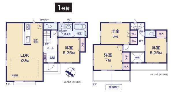 1F LDK 20.0帖 、1F 洋 5.2帖 、2F 洋 7.0帖 、2F 洋 6.0帖 、2F 洋 5.2帖
