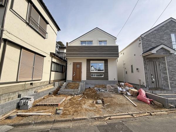 スタイリッシュな外観が目を引く新築住宅です。二階部分の大きな窓が印象的で明るい雰囲気を演出しています。前面道路が広く車の出し入れもスムーズに行えます。