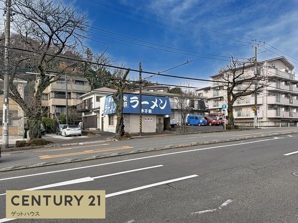 手前のラーメンとその後ろの白い戸建物件が本物件となります。 事業用物件としてもお使い頂けます。