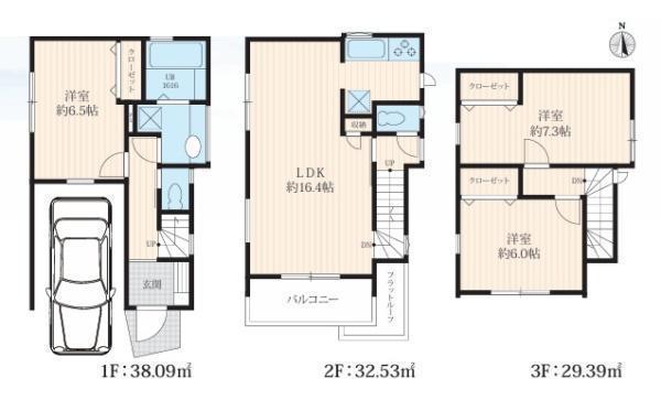 閑静な住宅地!ビルトインガレージ付!全居室6帖以上クローゼット付、2面採光!広々LDK約16帖!使い勝手の良い独立型キッチン!2階リビングで開放感がございます!