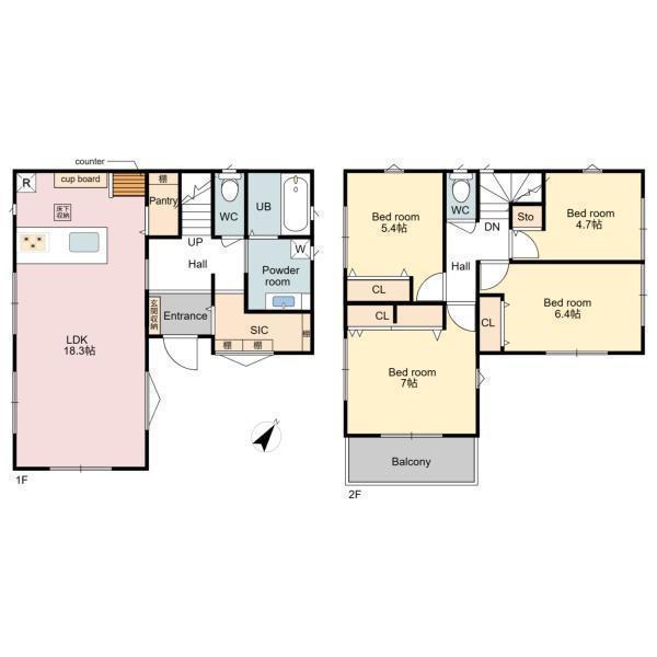 1F LDK 18.3帖 、2F 洋 7.0帖 、2F 洋 6.4帖 、2F 洋 5.4帖 、2F 洋 4.7帖