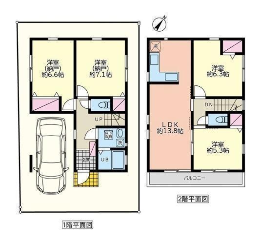 1F S(納戸) 7.1帖 、1F S(納戸) 6.6帖 、2F LDK 13.8帖 、2F 洋 6.3帖 、2F 洋 5.3帖