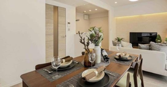 ナチュラルな色合いが印象的な空間です。インテリアと調和した落ち着いた雰囲気が広がっています。照明が明るく開放感を感じられるレイアウトです。ダイニングとリビングが自然に繋がっています。