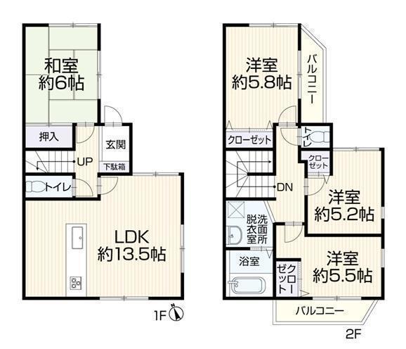 1F LDK 13.5帖 、1F 和 6.0帖 、2F 洋 5.8帖 、2F 洋 5.2帖 、2F 洋 5.5帖