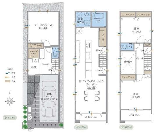 1F S(納戸) 8.5帖 、2F LDK 19.0帖 、3F 洋 8.2帖 、3F 洋 6.5帖