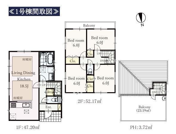 1F LDK 18.5帖 、2F 洋 6.0帖 、2F 洋 6.0帖 、2F 洋 6.0帖 、2F 洋 6.0帖