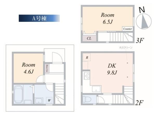 1F 洋 4.6帖 、2F DK 9.8帖 、3F 洋 6.5帖