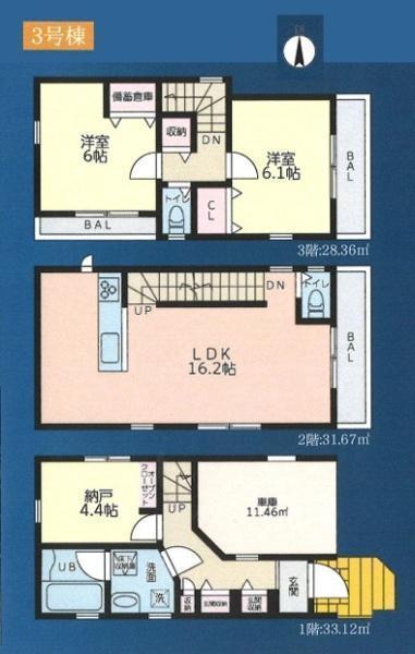1F S(納戸) 4.4帖 、2F LDK 16.2帖 、3F 洋 6.1帖 、3F 洋 6.0帖