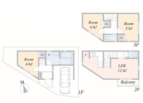 1F 洋 4.6帖 、2F LDK 12.6帖 、3F 洋 4.6帖 、3F 洋 5.6帖