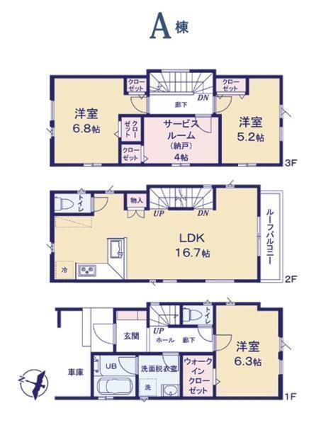 1F 洋 6.3帖 、2F LDK 16.7帖 、3F 洋 6.8帖 、3F 洋 5.2帖 、3F S(納戸) 4.0帖