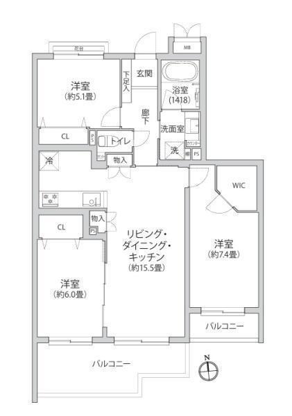 LDK 15.5帖 、洋 7.4帖 、洋 6.0帖 、洋 5.1帖