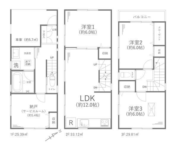 1F S(納戸) 5.4帖 、2F LDK 12.0帖 、2F 洋 6.0帖 、3F 洋 6.0帖 、3F 洋 6.0帖