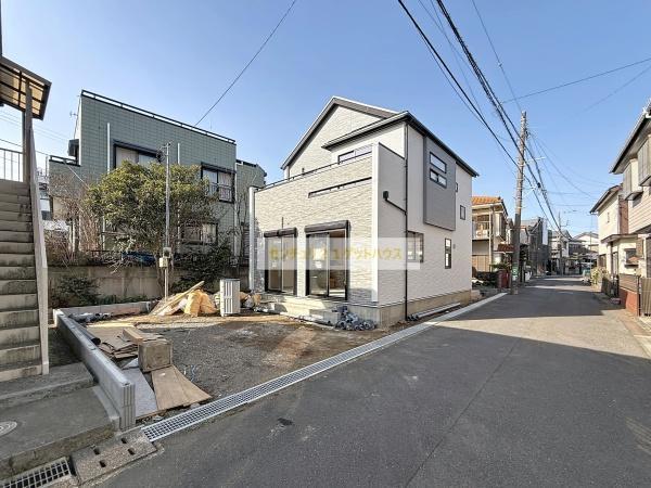 前面道路が広く車の出し入れもスムーズに行えます。周囲には落ち着いた住宅が立ち並び静かな環境が広がっています。家屋は日当たりも良く開放感のある雰囲気です。新築の外観が清潔感を演出しています。