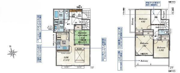 ゆったりとした4LDKの間取りで各部屋のスペースも確保されています。2階にはバルコニーが2か所あり使い勝手が良い設計です。1階には和室もあり多様な用途に対応できます。