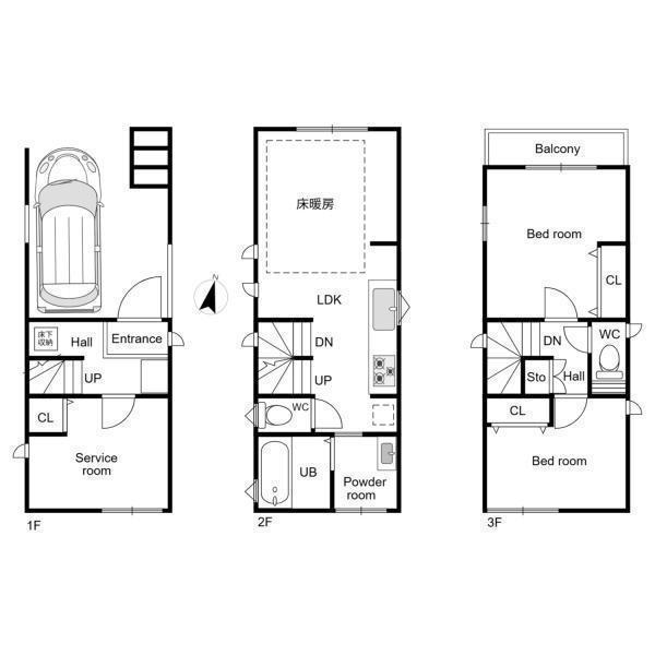 三階建てで各フロアがゆったりと使える間取りです。サービスルームや収納スペースも充実しています。リビングダイニングやバルコニーが設けられ快適な生活動線が確保されています。