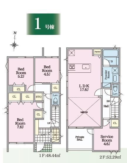 1F 洋 7.6帖 、1F 洋 5.2帖 、1F 洋 4.5帖 、2F LDK 17.6帖 、2F S(納戸) 4.6帖