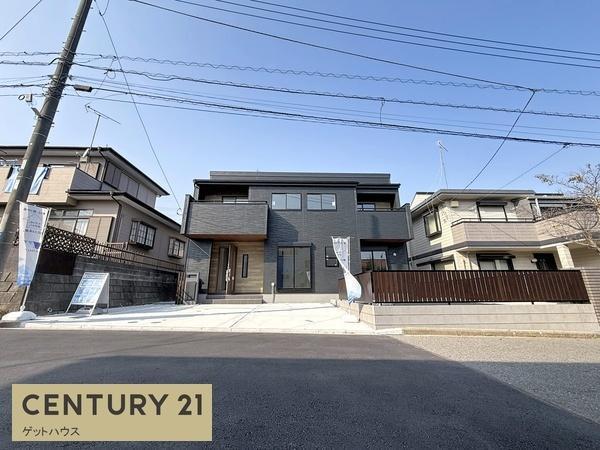 落ち着いた住宅街に位置する物件です。前面道路は幅があり車の出し入れがしやすそうです。外観はシンプルで現代的な印象を与えます。隣接する住宅とも適切な距離が確保されています。