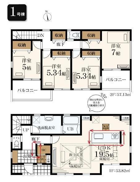 1F LDK 19.5帖 、2F 洋 7.0帖 、2F 洋 5.3帖 、2F 洋 5.3帖 、2F 洋 5.0帖