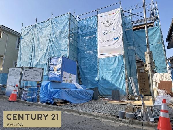 建築中の物件で外観はしっかりと足場と養生シートで囲まれています。新しい物件をご検討中の方におすすめです。現地の状況を確認しやすく進捗が一目でわかります。周囲の街並みにも自然に調和しています。