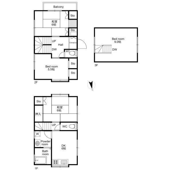 和室と洋室のバランスがとれた間取りです。収納スペースが豊富に配置されています。3階には広々としたベッドルームがあります。バルコニー付きで快適な環境を確保しています。